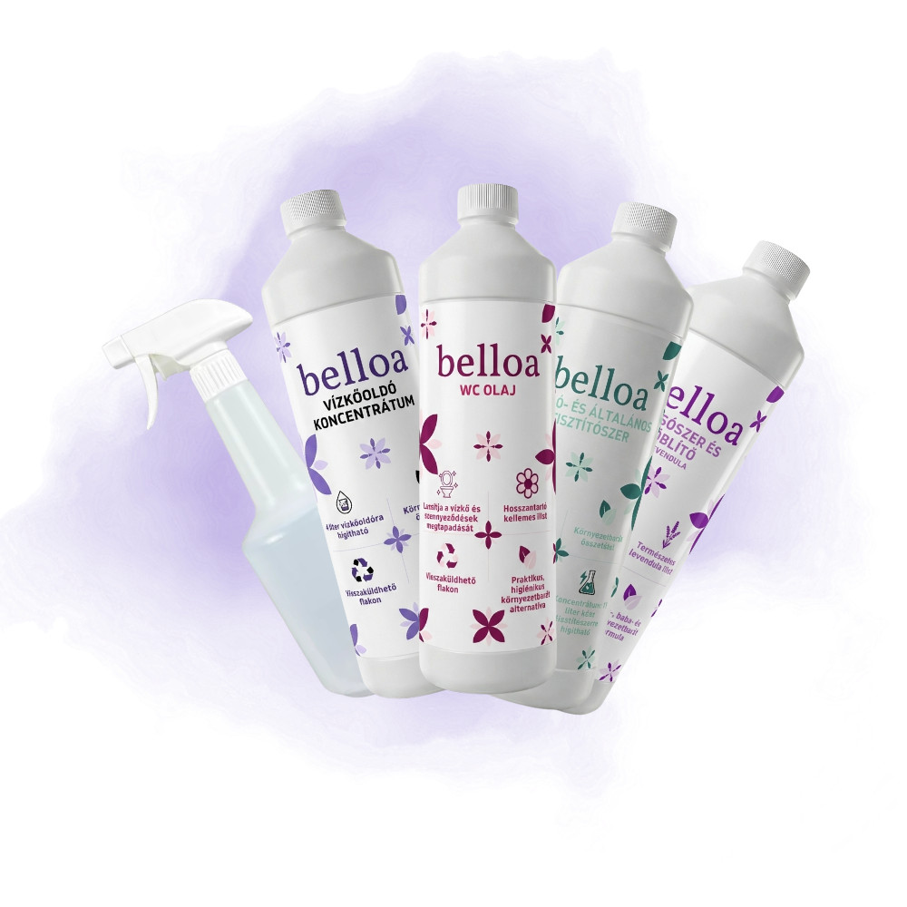 Belloa Vízkőoldó + WC-olaj + Padló- és általános tisztítószer + Mosószer és öblítő koncentrátum + ajándék szórófejes flakon